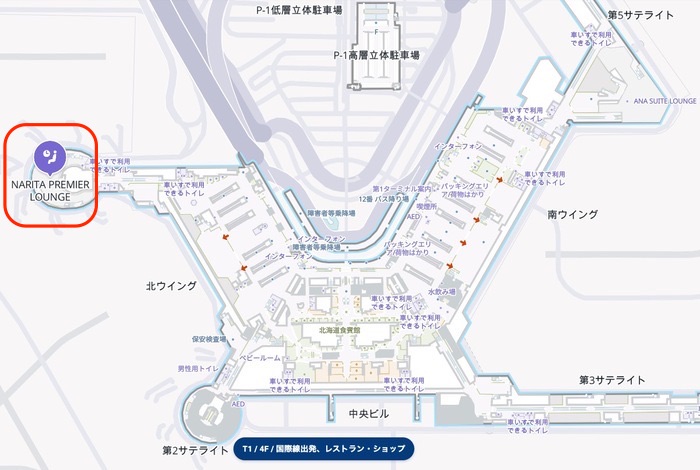 ラウンジは 成田空港 第1ターミナル・第1サテライト4階(出国手続き後エリア) に位置しています。