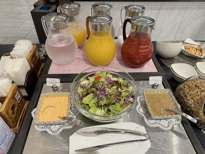 新鮮なサラダに加え、オレンジジュースやトマトジュースなど複数種類のジュースが並びます。
