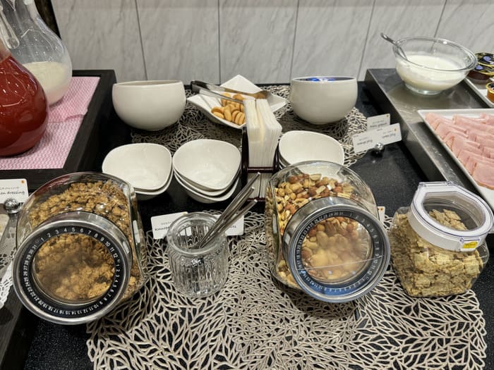 軽めの朝食として楽しめるシリアルやミックスナッツ、ヨーグルトも用意されています。