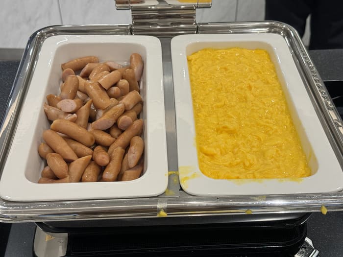 温かい料理として、定番のスクランブルエッグとソーセージが提供されています。