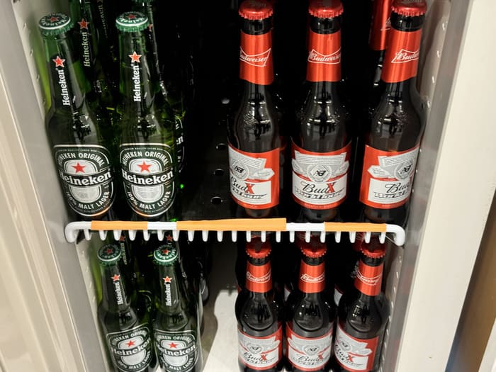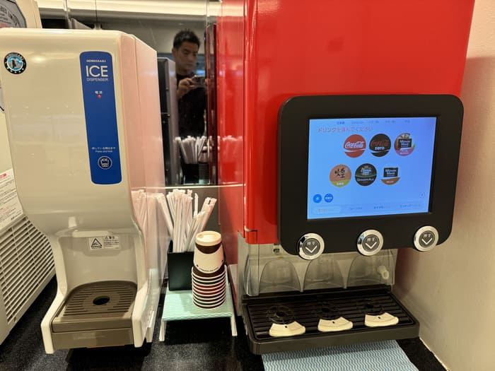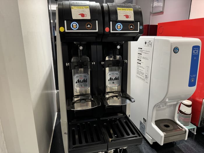 ドリンクサービスも非常に充実しており、アルコールからノンアルコールまで幅広く楽しめるのが特徴です。冷蔵庫にはハイネケンやバドワイザーといった定番ビールが並び、さらにアサヒの自動サーバーから注ぐ生ビールも用意されています。