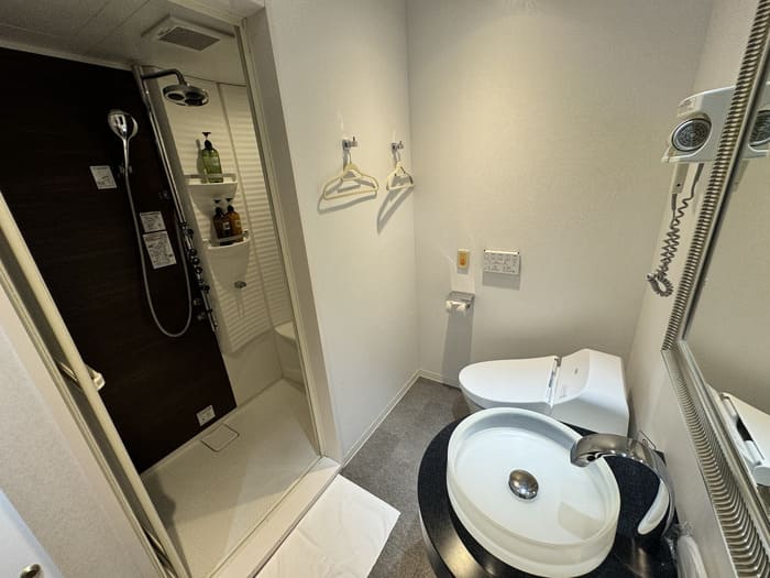 洗面台にはドライヤー・歯ブラシ・ヘアブラシ・シャワーキャップ・スリッパ・タオルが備え付けられており、手ぶらでも安心して利用可能です。温水洗浄便座や衣類用ハンガーもあり、出張や長旅の合間に身支度を整えるのに最適です。