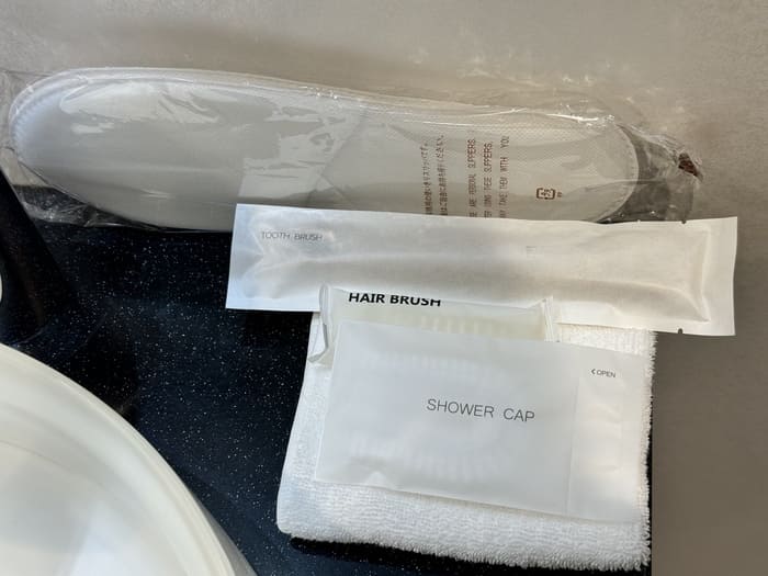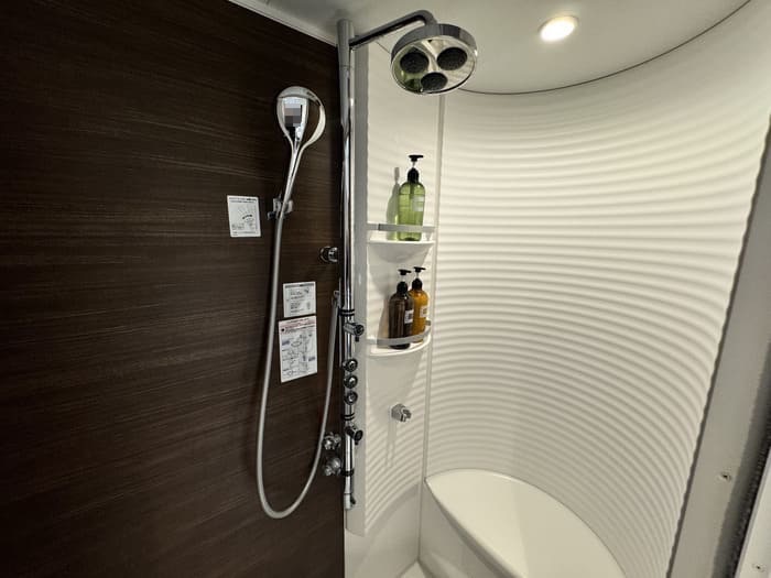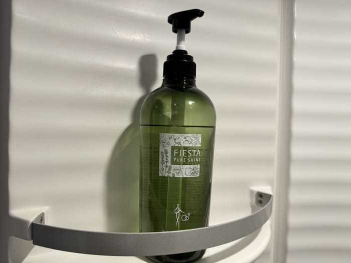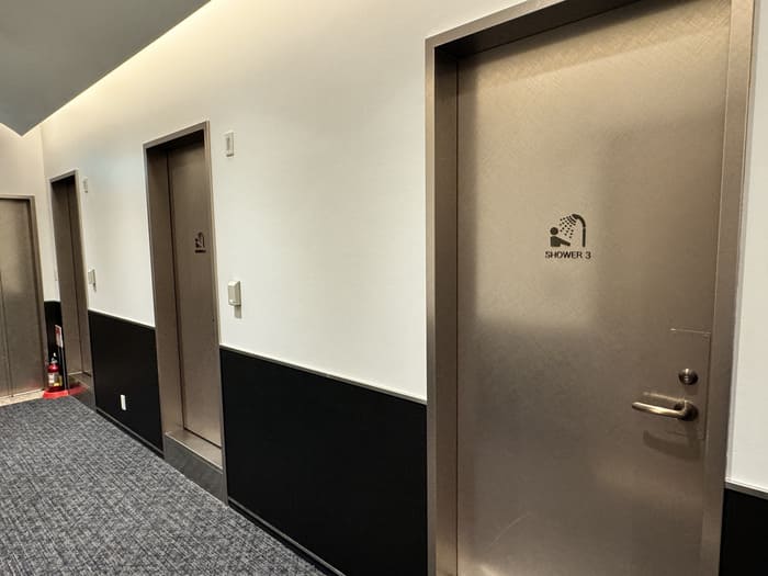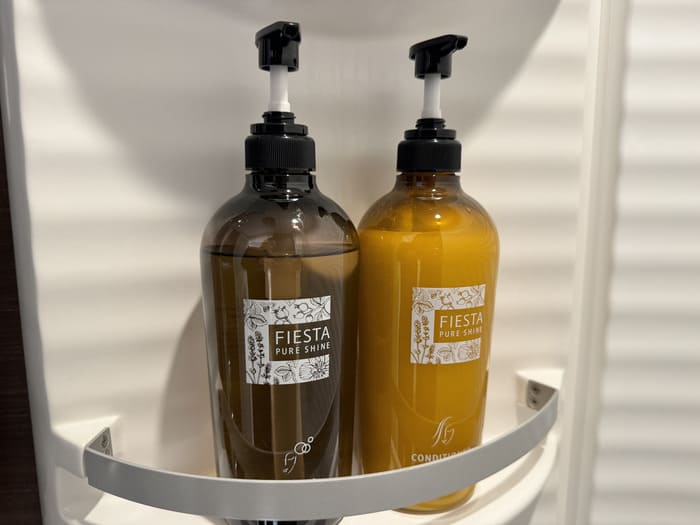 シャワーブースにはレインシャワーとハンドシャワーの両方を完備し、水圧・温度ともに安定。アメニティは「FIESTA PURE SHINE」シリーズが採用されており、シャンプー・コンディショナー・ボディソープが揃っています。植物由来のやさしい香りで、ラウンジとは思えないほど上質なバスタイムを楽しめます。