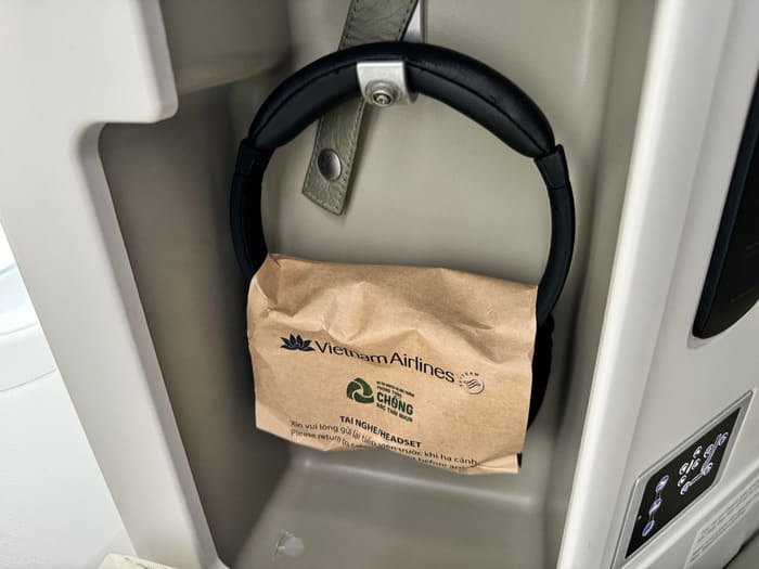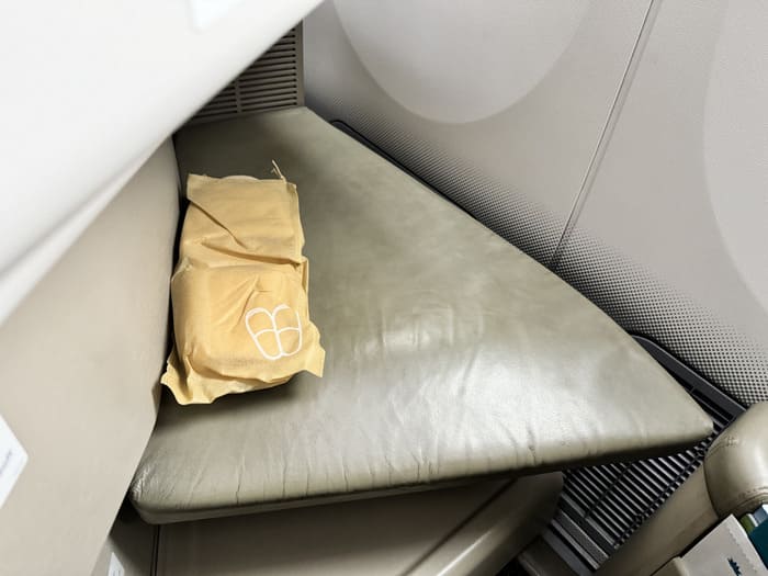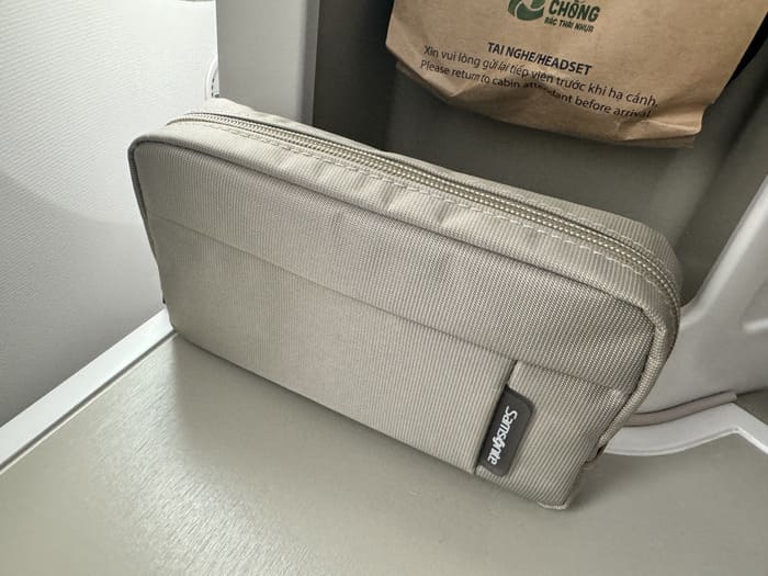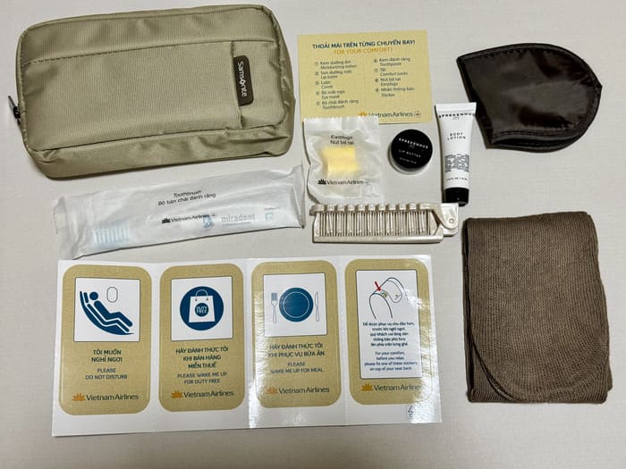 ベトナム航空のビジネスクラスでは、落ち着いたベージュトーンのポーチに入ったアメニティキットが配布されます