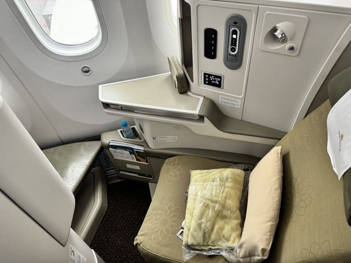 ゆったりとした配列が印象的なベトナム航空のビジネスクラスシート。落ち着いたグリーン系の色合いで統一され、高級感と清潔感のあるデザインです。