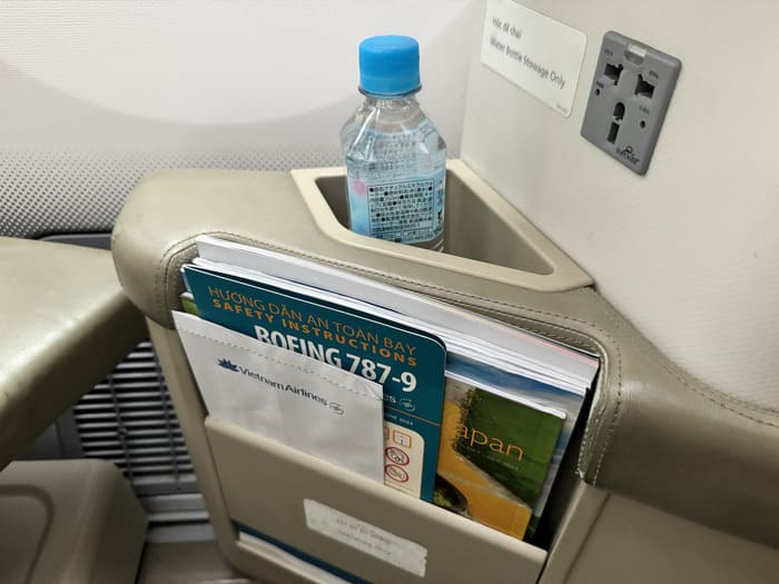安全のしおりや雑誌が整然と収納され、水のボトルホルダーも完備。細かな気配りがうかがえます。