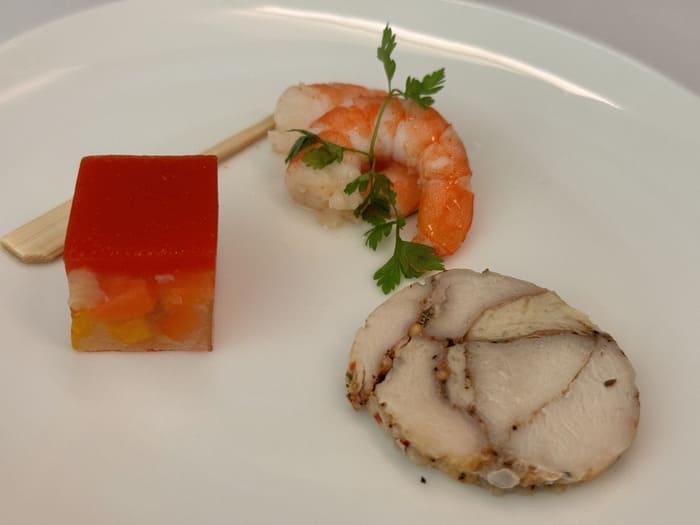 海老と野菜のテリーヌ、チキンロールの冷製など、色彩も美しい前菜。軽やかな口当たりで、フライトのスタートにぴったりです。