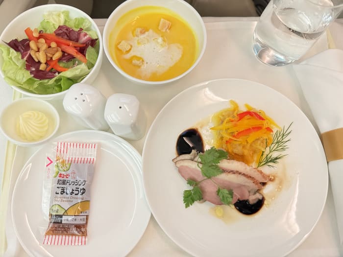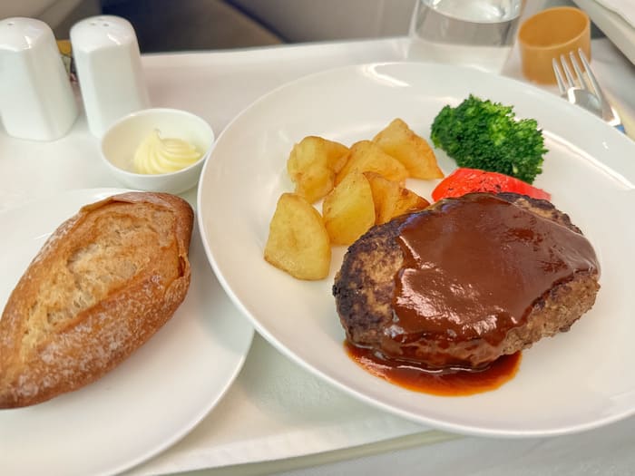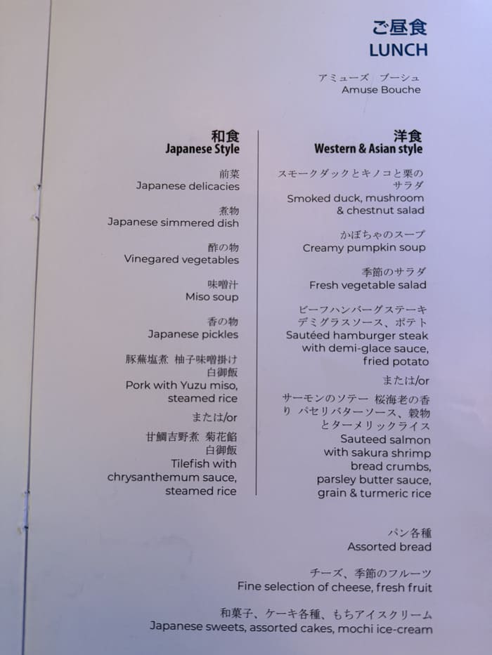 その後、前菜、メイン、デザートの順に提供され、洋食と和食から選択可能でした。今回は洋食を選びましたが、和食の方が多い印象でした。