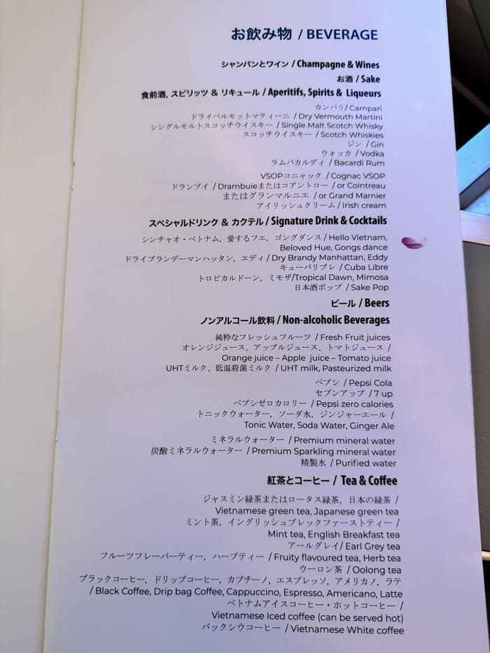 ワイン、スピリッツ、カクテルに加え、ベトナムコーヒーやグリーンティーなどノンアルコールも充実。長距離フライトでも飽きることなく楽しめる構成です。
